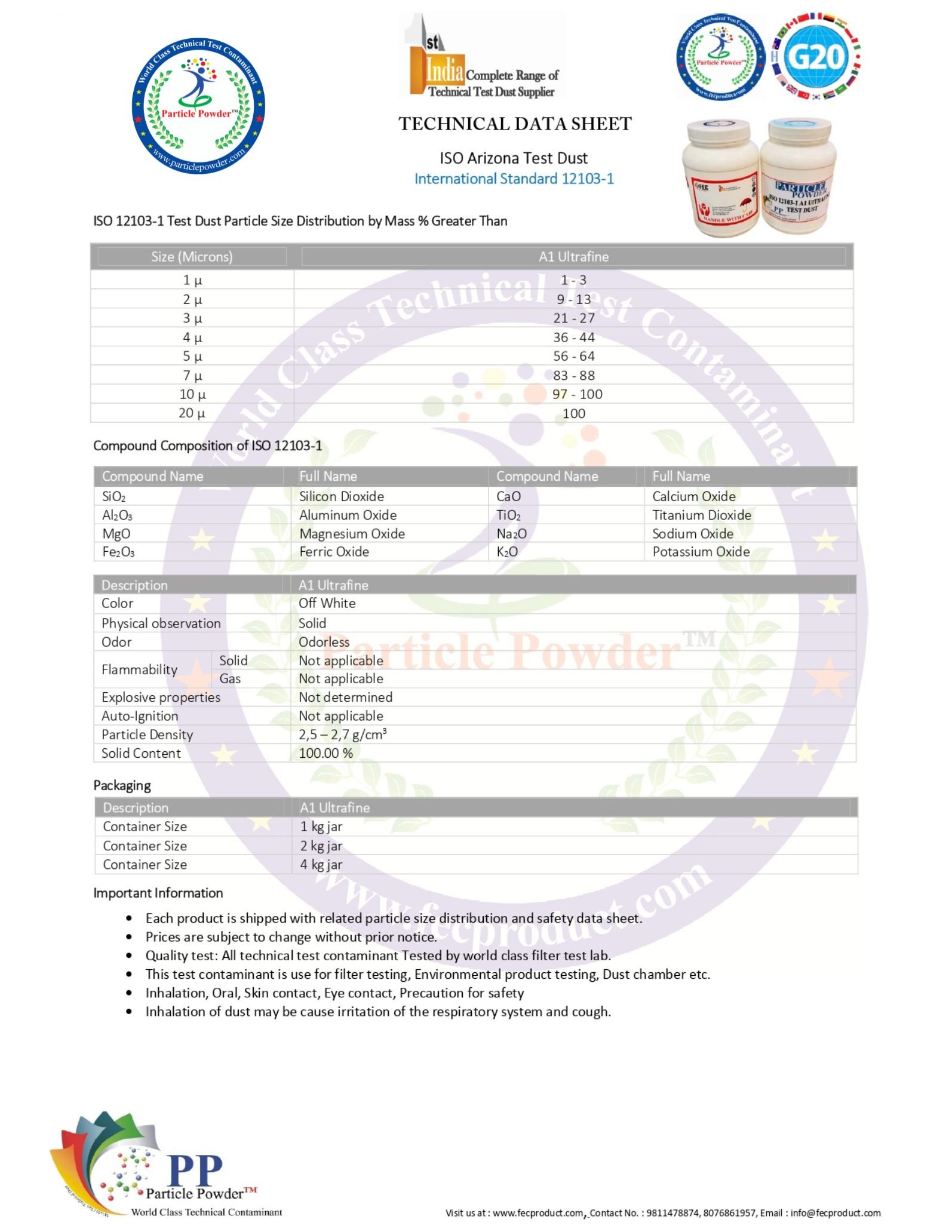 ISO 12103-1 A1 Ultrafine Test Contaminant Technical Sheet